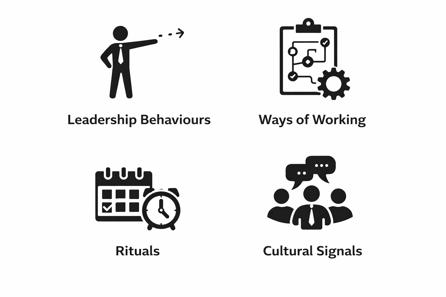 Impact comes from organisation—aligning behaviours, ways of working, rituals and cultural signals so the system reinforces the shift.